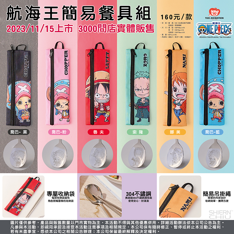 『ONE PIECE簡易餐具組』 ★7-ELEVEN於2023/11/15限定上架販售,數量有限售完為止 推出6款「ONE PIECE簡易餐具組」在7-11限定門市開賣 「ONE PIECE簡易餐具組」:304不鏽鋼一體成形打造、附可吊掛的專用收納袋 活動日期:2023/11/15 於指定販售門市開賣 地點:全台7-ELEVEN 3000家門市哪裏買 請點我 售價: 「ONE PIECE簡易餐具組」:NT$250 ※實際以門市到貨數量/狀況為主
